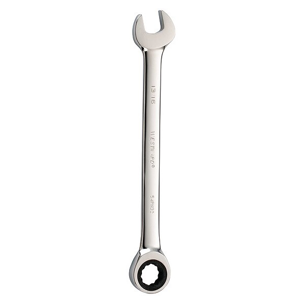 Ratcheting Wrench, Alloy Steel, Chrome, Head Size 13/16 in, Overall Length 11 1/2 in, Head Offset Angle 0 Degrees , Opening Angle (Deg.) 15 Degrees , Standard, Head Thickness 1/2 in, SAE, Rounded
