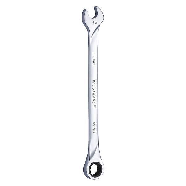 Ratcheting Wrench, Alloy Steel, Chrome, Head Size 16 mm, Overall Length 10 1/8 in, Head Offset Angle 0 Degrees , Opening Angle (Deg.) 15 Degrees , Standard, Head Thickness 3/8 in, Metric, Rounded