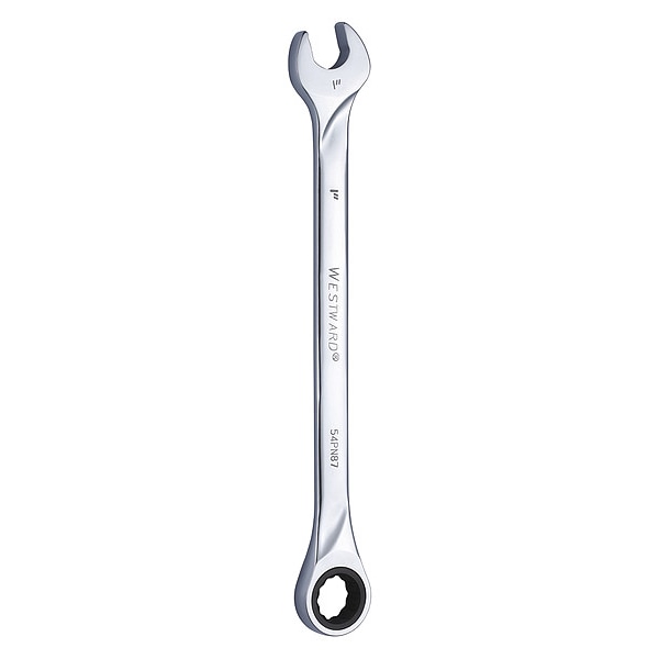Ratcheting Wrench, Alloy Steel, Chrome, Head Size 1 in, Overall Length 14 1/2 in, Head Offset Angle 0 Degrees , Opening Angle (Deg.) 15 Degrees , Standard, Head Thickness 9/16 in, SAE, Rounded