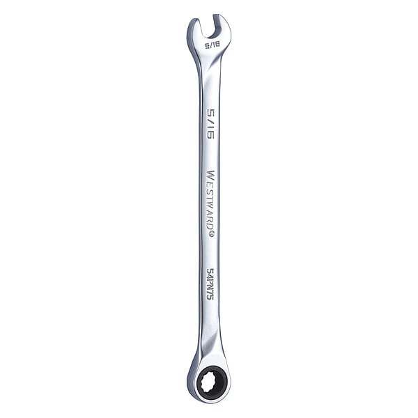 Ratcheting Wrench, Alloy Steel, Chrome, Head Size 5/16 in, Overall Length 5 7/8 in, Head Offset Angle 0 Degrees , Opening Angle (Deg.) 15 Degrees , Standard, Head Thickness 1/4 in, SAE, Rounded