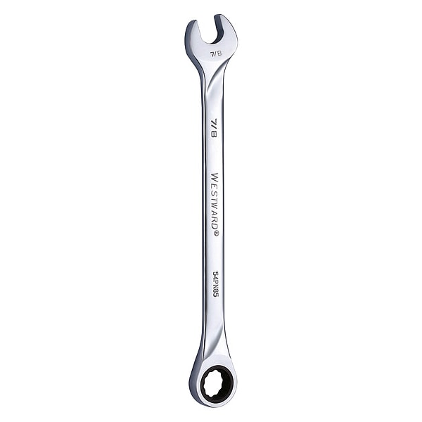 Ratcheting Wrench, Alloy Steel, Chrome, Head Size 7/8 in, Overall Length 13 in, Head Offset Angle 0 Degrees , Opening Angle (Deg.) 15 Degrees , Standard, Head Thickness 1/2 in, SAE, Rounded