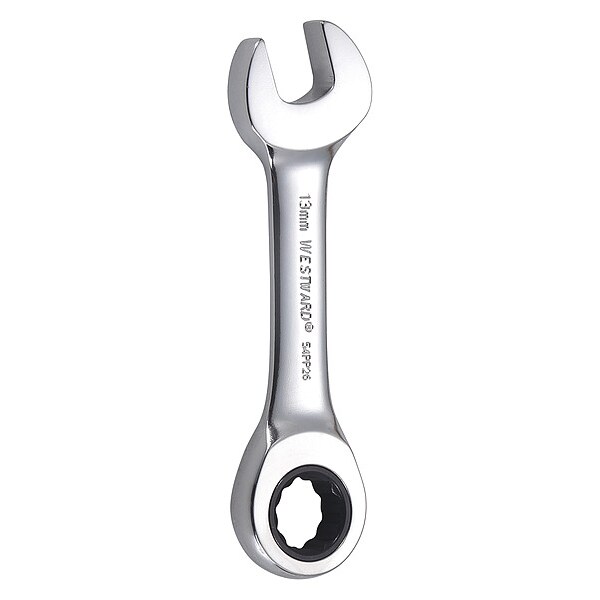 Ratcheting Wrench, Alloy Steel, Chrome, Head Size 13 mm, Overall Length 4 1/8 in, Head Offset Angle 0 Degrees , Opening Angle (Deg.) 15 Degrees , Standard, Head Thickness 5/16 in, Metric, Rounded