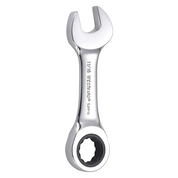 Ratcheting Wrench, Alloy Steel, Chrome, Head Size 11/16 in, Overall Length 4 7/8 in, Head Offset Angle 0 Degrees , Opening Angle (Deg.) 15 Degrees , Standard, Head Thickness 7/16 in, SAE, Rounded