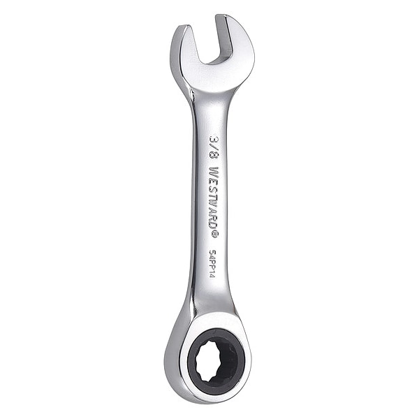 Ratcheting Wrench, Alloy Steel, Chrome, Head Size 3/8 in, Overall Length 3 5/8 in, Head Offset Angle 0 Degrees , Opening Angle (Deg.) 15 Degrees , Standard, Head Thickness 5/16 in, SAE, Rounded