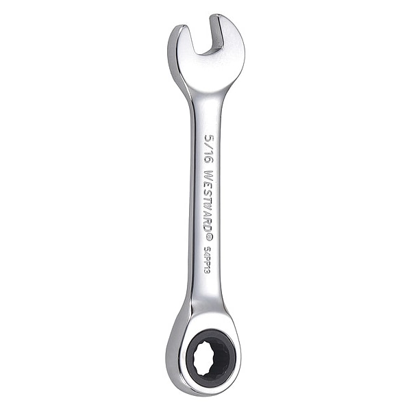 Ratcheting Wrench, Alloy Steel, Chrome, Head Size 5/16 in, Overall Length 3 1/2 in, Head Offset Angle 0 Degrees , Opening Angle (Deg.) 15 Degrees , Standard, Head Thickness 1/4 in, SAE, Rounded