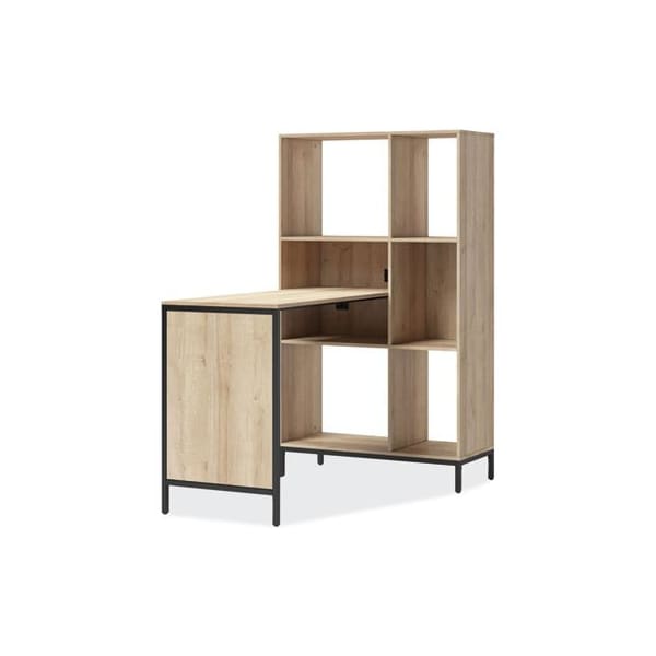 Unique Turing Home Office Workstation with Integrated Bookcase & Power Center features a wide, seat-high worksurface tucked into its integrated bookcase, forming an attractive, T-shaped effect, with the bookcase flush to a wall and the worksurface flowing out. With plenty of space to both stretch out and store what you need, it's the perfect all-in-one solution for smaller spaces where maximum productivity is required. The integrated power center features two AC outlets and two USB charging ports conveniently located just under the worksurface within the bookcase. Simply plug the workstation into the nearest AC outlet, and power up all of your important devices without creating a tangled mess of cables. Assembly required. Series Name: Whalen Turing; Worksurface/Base Color: Desert Ash/Black; Color Family: Beige; Worksurface Shape: Rectangular.