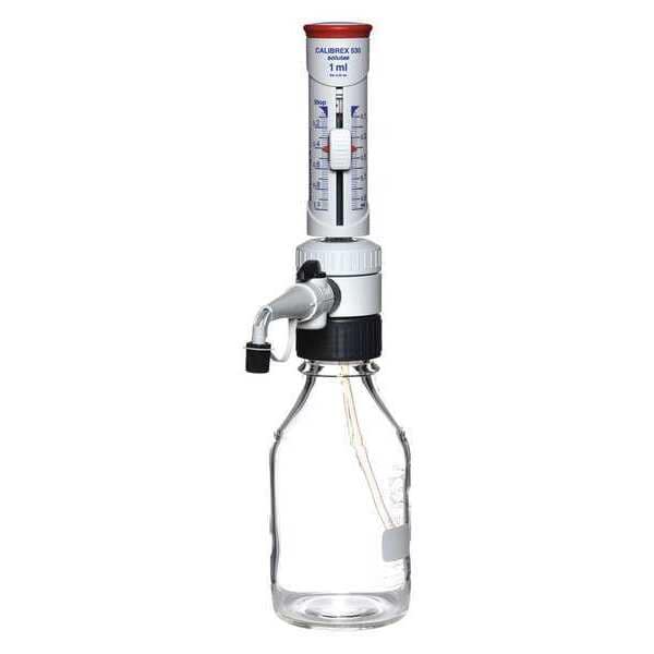 Bottle Top Dispenser, Capacity - Metric 1 mL, Graduation Increments - Metric 0.02 mL, Minimum Graduation - Metric 0.1 mL, Maximum Graduation - Metric 1 mL, Product Type Bottle Top Dispenser, For Use With Bottles, Autoclavable Yes, Accuracy max. vol. +/-0.6 Percent, mid. vol. +/-1.8 Percent, min. vol. +/-3.0 Percent, Graduated Yes, Includes PFA Coated Plunger, Thread Size 45 mm