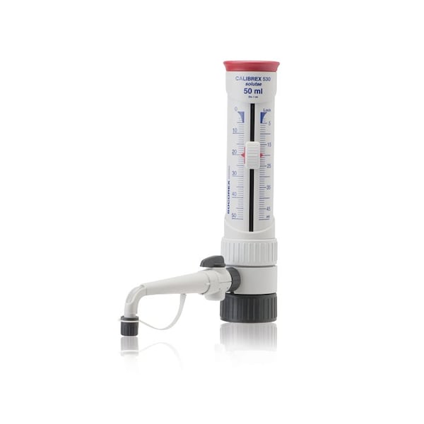 Bottle Top Dispenser, Capacity - Metric 1 mL, Graduation Increments - Metric 0.02 mL, Minimum Graduation - Metric 0.1 mL, Maximum Graduation - Metric 1 mL, Product Type Bottle Top Dispenser, For Use With Bottles, Autoclavable Yes, Accuracy max. vol. +/-0.6 Percent, mid. vol. +/-1.8 Percent, min. vol. +/-3.0 Percent, Graduated Yes, Includes Flow Control Stopcock, PFA Coated Plunger, Thread Size 45 mm
