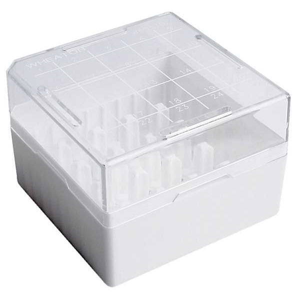 Freezer BoxWhite, Overall Height 2.09 In., Overall Width 2.95 In., Overall Length 2.95 In.Holds 25 Internally or Externally Threaded Cryogenic Vials, Min. Temp. Rating -156 Degrees C, Max. Temp. Rating 80 Degrees C