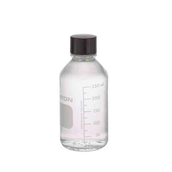 Media Bottle, Body Color Clear, Body Diameter - Metric 67 mm, Bottle Type Media, Capacity - Metric 250 mL, Capacity - English 8.45 fl oz, Overall Height - Metric 152 mm, Closure Included Yes, Closure Liner Material Rubber, Screw Closure Size 33-430 mm, Closure Color Black, Mouth Size Wide, Autoclavable Yes, Graduated Yes, Sterile/Non-Sterile Non-Sterile, Graduation Increments - Metric 50 mL, USP Specification Type I, Closure Material Phenolic