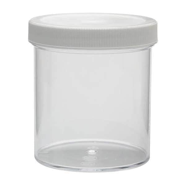 Jar, Capacity - Metric 500 mL, Capacity - English 16.9 fl oz, Closure Included Yes, Closure Liner Material Polyethylene, Body Diameter - Metric 85 mm, Body Material Polystyrene, Overall Height - Metric 99 mm, Screw Closure Size 89-400 mm, Closure Type Screw On, Closure Material Polypropylene, Closure Color White, Body Color Clear, Mouth Size Wide, Basic Material Plastic, Shape Round, Package Quantity 24