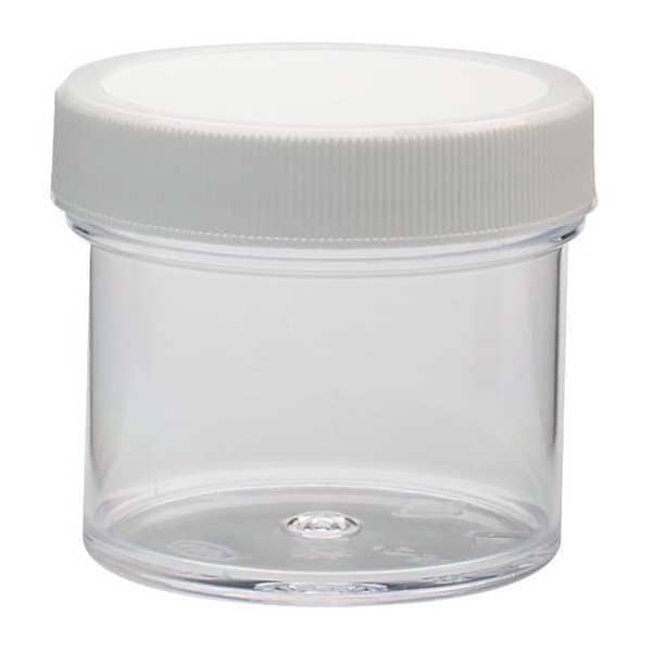 Jar, Capacity - Metric 60 mL, Capacity - English 2 fl oz, Closure Included Yes, Closure Liner Material Polyethylene, Body Diameter - Metric 49 mm, Body Material Polystyrene, Overall Height - Metric 46 mm, Screw Closure Size 53-400 mm, Closure Type Screw On, Closure Material Polypropylene, Closure Color White, Body Color Clear, Mouth Size Wide, Basic Material Plastic, Shape Round, Package Quantity 48