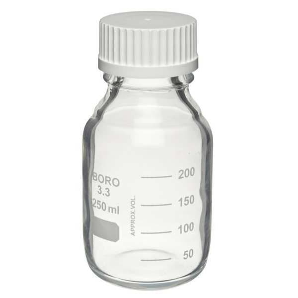 Safety Coated Media Bottle, Body Color Clear, Body Diameter - Metric 70 mm, Bottle Type Media, Capacity - Metric 250 mL, Capacity - English 8.45 fl oz, Overall Height - Metric 144 mm, Closure Included Yes, Closure Liner Material Unlined, Closure Color White, Mouth Size Wide, Autoclavable Yes, Graduated No, Sterile/Non-Sterile Non-Sterile, Graduation Increments - Metric Not Applicable, USP Specification Type I, Closure Material Polypropylene