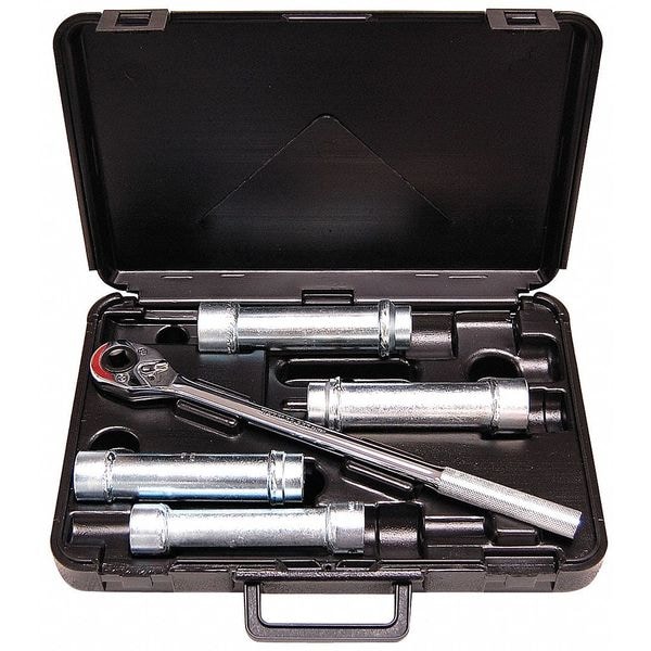 This five-piece set comes neatly packed in a plastic case with molded fit container features for secure storage and transport. The case measures fifteen inches wide by eleven inches long with a height of three-and-a-half inches making it compact enough for easy handling yet spacious enough to accommodate all components comfortably. It's worth noting that while this kit does include pear head ratchets measuring eleven inches each, it does not come with any additional drive tools.