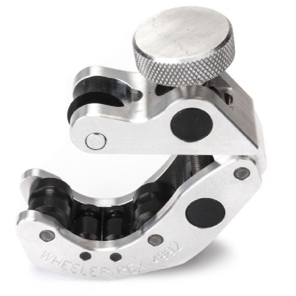 WHEELER-REX 4992 Close Quarters Tubing Cutter 1/4in - 2-3/8in Made specifically for plumbing remodeling, commercial boiler and air conditioning jobs where standard cutters simply donftt have the room. Cuts thin-wall material like traps and tailpieces with no distortion. Good for under vanities, close to walls, waste and overflows. Eliminates sawing which can loosen joints. New Features: - Now offering a plastic cutter wheel to cut through the wall thickness on larger diameter plastic pipe ie: 2in yellow plastic gas line.- A sleeker look, tool-less pin. The pin holds in place with a ball detent feature.- Just push it out with your thumb. Specifications: For 1/4in to 2-3/8in 6-59mm O.D. non-ferrous tube and plastic pipe and tube.Weight 1.5lbs .7Kg Use the 8038 replacement cutter wheel for copper included Use the 8033 replacement cutter wheel for plastic / ABS sold separately