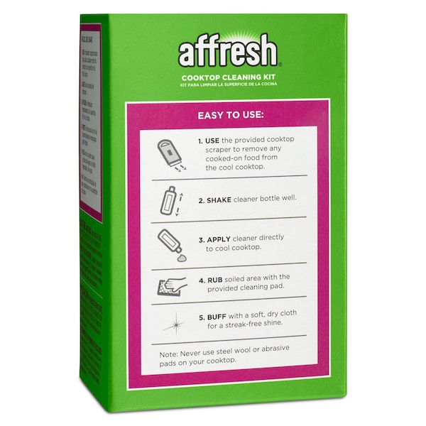 affresh Cooktop Cleaning Kit includes a scraper and scrub pad that remove build-up and cooked-on spills without scratching or harming your cooktop surfaces and a non-abrasive cleaner that is safe for all glass and ceramic cooktops. Use monthly or as needed to polish your cooktop and keep it looking like new.#1 Recommended by: Whirlpool, KitchenAid and Maytag Brands. Cuts through tough cooked-on residues for a streak-free polished shine. Polishes your cooktop. Removes soil build-up and cooked-on spills without scratching or harming cooktop surfaces scraper and scrub pad. Non-abrasive cleaner is safe for all glass and ceramic cooktops. Non-abrasive cleaning pad removes soils without scratching or harming cooktop surfaces. Will not scratch cooktop surfaces Cleaning Pads, Scraper, or Cleaner. Scraper retracts and locks for convenient blade storage. Use monthly or as needed