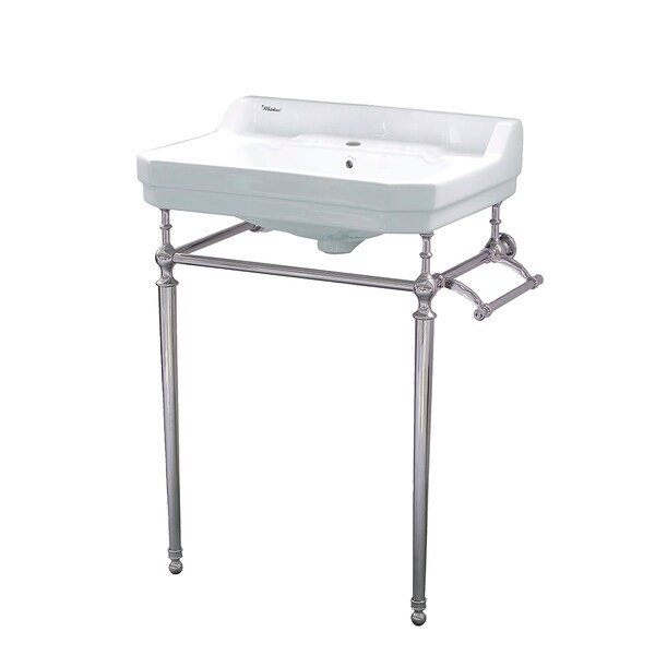 Victoriahaus Bathroom Console by Whitehaus Collection creates an elegant look to any décor. Crafted from the highest quality vitreous china available, this basin is as durable as it is luxurious. The smooth, seamless design of the English style basin has an integrated rectangular bowl, backsplash, dual soap ledges and a charming decorative trim. Offered in your choice of single or widespread faucet hole drilling, it has a center drain location and overflow. The exquisitely crafted Victoriahaus Console is wall mounted with beautifully detailed leg supports and a towel bar that can be installed on either side. Leg supports with the towel bar are offered in your choice of four finishes: Polished Chrome, Brushed Nickel, Polished Nickel, or Polished Brass to enhance your ideal bathroom design.