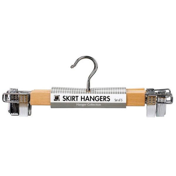 Features Assembled Length: 13-1/2 in. Assembled Height: 5 in. Assembled Width: 1 in. Product Type: Skirt Hanger Color Family: White Material: Wood Number in Package: 5 pk 1in x 13.5in x 4.9in. Chrome neck. Clear lacquer finished wood with padded clips.