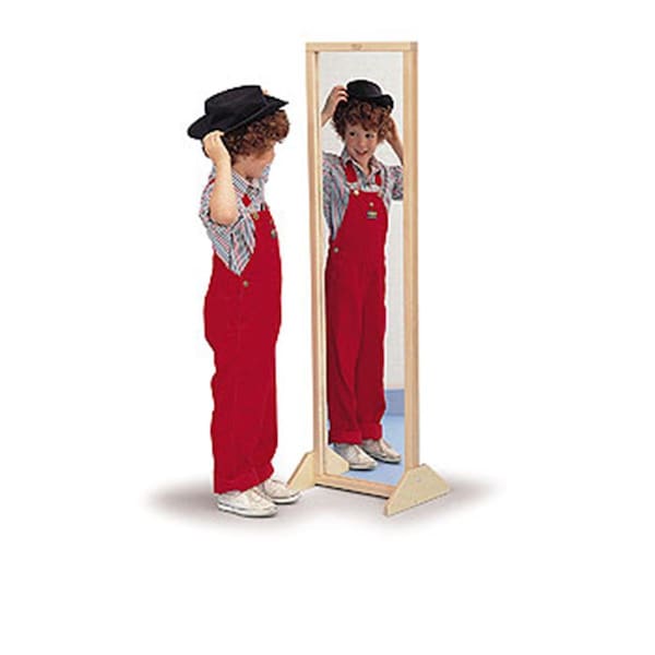 This highly reflective and safe acrylic mirror mounted in a hardwood Maple frame. Feet can be attached to stand vertically or horizontally.