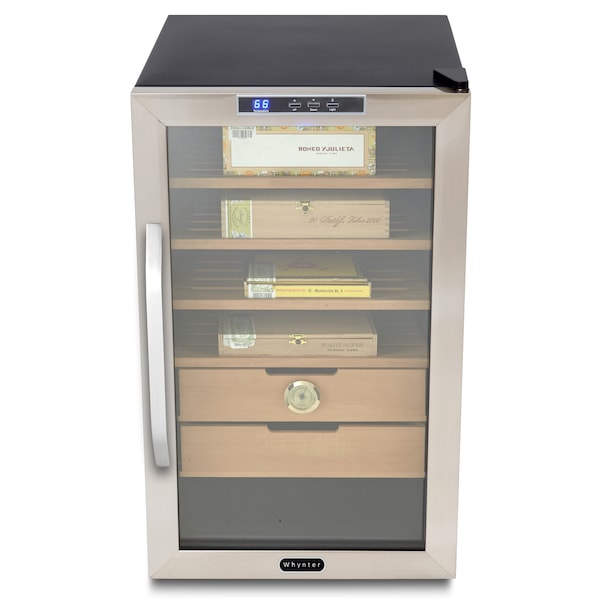 Whether you are a true cigar aficionado or a casual enthusiast, the Whynter CHC-251S Stainless Steel 400 count Cigar Cooler Humidor is an ideal cigar storage system for you. The four Spanish Cedar shelves and two spacious drawers are hand crafted of all Spanish Cedar wood. This helps maintain humidity, emits a light complementary aroma, and repels damaging insects. The Whynter CHC-251S is designed to help store and age cigars within the optimal humidity range 62% to 75%. This cigar cooler humidor contains a humidification tray (for use with your preferred solution/moisture beads – not included) and equipped with an elegant analog hygrometer which accurately monitors the level of humidity inside the unit. Maintaining a temperature controlled environment is also critical for discouraging the proliferation of any pests that may be present in the tobacco leaves. The thermoelectric cooling system used here minimizes the drying effect when cooling. The Whynter 400 Count Cigar Cooler is the perfect solution to storing, preserving, and aging cigars. It is also an attractive and elegant showcase for your prized collection.