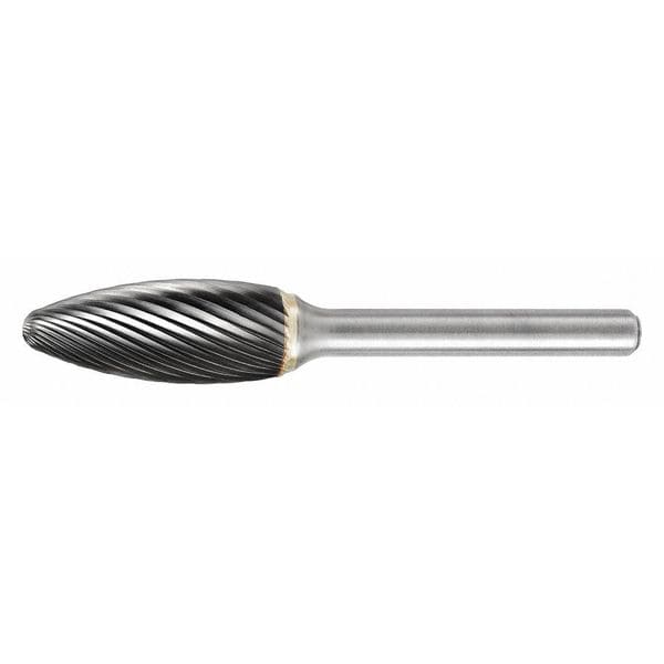 Carbide Bur, End Type Pointed, Cut Type Single, Shank Dia. 1/4 in, Head Dia. 1/2 in, Head Length 1 1/4 in, Included Angle Not Applicable, Overall Length 3 in, Trade Number SH-05, Head Shape Flame, System of Measurement Inch, Shank Material Steel