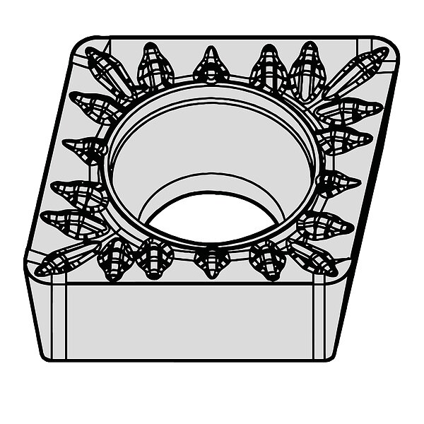 Diamond Turning Insert, Chip-Breaker Code MP, Inscribed Circle 1/4 in, Bright (Uncoated), ANSI Code CCMT2151MP, Chip-Breaker Style On One Side, Clearance Angle 7 Degrees