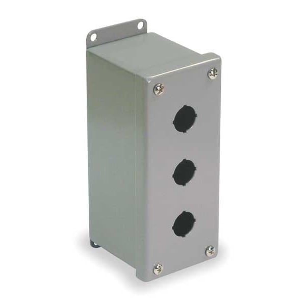 Push Button Enclosure, Number of Columns 1, Number of Holes 3, NEMA Rating 12, 13, Conduit Size No Conduit Entrance Holes Provided, Dimensions 7.00 in H x 2.75 in W x 3.50 in D, Hole Size 22 mm, Material Carbon Steel, Height 7 in, Width 2.75 in, Depth 3.5 in, Color Gray, Includes Captive Cover Screws, Closed Cell Oil Resistant Gasket, Type Miniature, Mounting Style External Plates, Standards cULus, UL Listed
