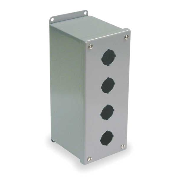 Push Button Enclosure, Number of Columns 1, Number of Holes 4, NEMA Rating 12, 13, Conduit Size No Conduit Entrance Holes Provided, Dimensions 8.88 in H x 2.75 in W x 3.50 in D, Hole Size 22 mm, Material Carbon Steel, Height 8.88 in, Width 2.75 in, Depth 3.5 in, Color Gray, Includes Captive Cover Screws, Closed Cell Oil Resistant Gasket, Type Miniature, Mounting Style External Plates, Standards cULus, UL Listed