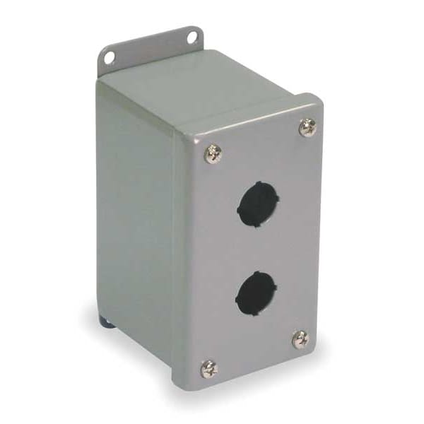 Push Button Enclosure, Number of Columns 1, Number of Holes 2, NEMA Rating 12, 13, Conduit Size No Conduit Entrance Holes Provided, Dimensions 6.00 in H x 4.00 in W x 4.81 in D, Hole Size 30 mm, Material Carbon Steel, Height 6 in, Width 4 in, Depth 4.81 in, Color Gray, Includes Captive Cover Screws, Closed Cell Oil Resistant Gasket, Type Extra Deep, Mounting Style External Plates, Standards cULus, UL Listed
