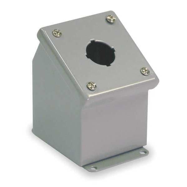 Push Button Enclosure, Number of Columns 1, Number of Holes 1, NEMA Rating 12, 13, Conduit Size No Conduit Entrance Holes Provided, Dimensions 3.50 in H x 3.25 in W x 4.78 in D, Hole Size 30 mm, Material Steel, Height 3.5 in, Width 3.25 in, Depth 4.78 in, Color Gray, Includes Captive Cover Screws, Closed Cell Oil Resistant Gasket, Grounding Stud, Type Sloping Front, Mounting Style External Feet, Standards cULus