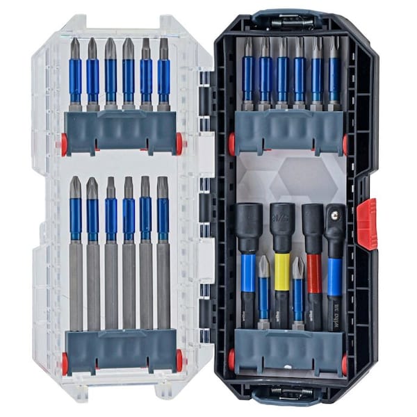 Introducing the Terminator Blue Power Tool Accessory Kit, housed in the revolutionary GoStack box-a game-changer for tool storage and transport. Designed for durability, the innovative GoStack boxes securely attach to one another, creating a modular, space-saving storage system that’s perfect for professionals and DIY enthusiasts alike. Inside, you’ll find impact-rated, rigorously heat-treated driver bits that deliver an exceptional 120 times the service life of standard bits, crafted with the tightest-fit, precision-machined tips from the industry leader in precision engineering. Elevate your toolkit with unmatched performance and organization, Set Includes: Phillips #1 (2), #2 (4), Square #2 (2), Torx T20 (2), T25 (2), T30 (2) - all 50mm; Phillips #2 (2), Square #2, Torx T20, T25, T30 - all 90mm; Nut Setters 1/4", 5/16", 3/8", Socket Adapter 3/8" - all 76mm TST Torsion Stabilizing Technology for maximum flex and reduced tip stress Computer-controlled heat treatment for 120 times service-life over Wiha standard bits Tuned torsion zone for maximum flex and reduced tip stress CVM premium quality tool steel for strength and durability Exact fit precision machined tips for reduced cam-out Fit with a standard 1/4 inch hex drive Bit lengths available: 1-inch; 2-inch; 3.5-inch Impact-rated for power tool applications Minimum hardness tolerance of 61 RHC +/- 1