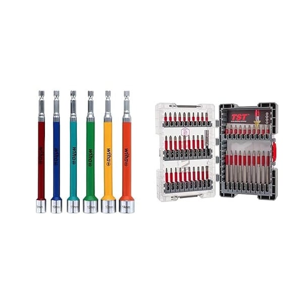 Product 1: Set Includes: 8, 10, 11, 12, 13, 14mmProduct 1: High-visibility color coding for quick and easy size identificationProduct 1: Magnetic nut setters metric on standard 1/4-inch hex drive for universal applicationProduct 1: Exact fit precision machined tip for reduced cam-outProduct 2: Set Includes: 29mm bits: 2PH1,3PH2,PH3, SQ1,2SQ2,SQ3, T10,2T15,2T20,3T25,T30,T40 | 49mm bits: 1PH1,3PH2,PH3, SQ1,2SQ2,SQ3, T10,2T15,2T20,3T25,T30,T40 | 89mm bits: PH1,PH2,T10,T15,T20,T25,T30,T40,SQ1,SQ2 | 1/4 x 60mm Magnetic bit holderProduct 2: Energy-absorbing Torsion Zone for 120 times performance over Wiha standard bitsProduct 2: CVM premium quality tool steel for strength and durabilityProduct 2: Exact fit precision machined tip for reduced cam-out
