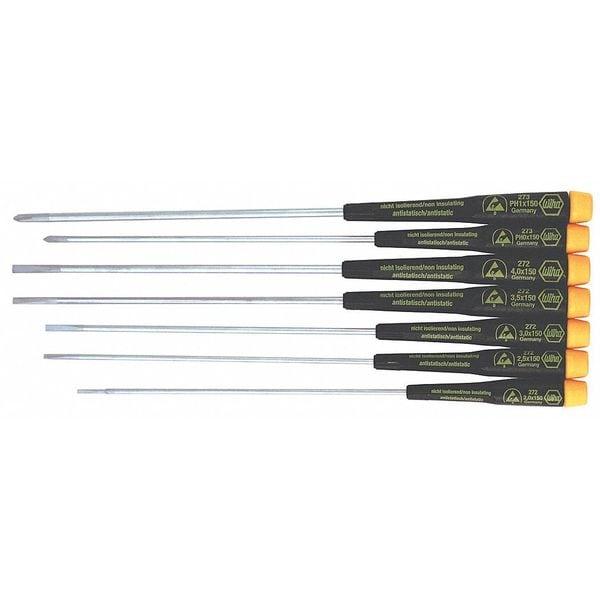 ESD Safe Precision Screwdriver Set, Tip Finish Chrome, 2 mm, 2.5 mm, 3 mm, 3.5 mm, 4 mm, Phillips, Slotted, Ergonomic, Number of Pieces 7, No, ESD Safe Yes, Non-Sparking No, Measurement Type Metric, Includes Slotted 2.0 x 150mm, 2.5 x 150mm, 3.0 x 150mm, 3.5 x 150mm, 4.0 x 150mm, Phillips #0 x 150mm, #1 x 150mm, Corrosion Resistant Yes, ESD Standard IEC 61340-5-1, Tether Ready No, Range of Shank Lengths 150 mm