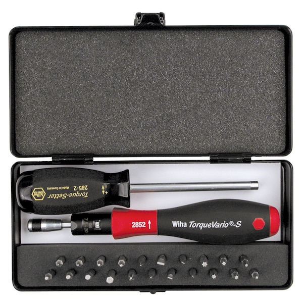 TorqueVario-S Handle 15-80 In/oz Micro Bit 24 Piece Set In Storage Box. Slotted 1.5, 2.0, 3.0, 4.0mm Phillips #00, 0, 1 Torx® T6, T7, T8, T9, T10, T15 Hex Inch .050, 1/16, 5/64, 3/32, 7/64, 1/8, 9/64, 5/32" Bits.