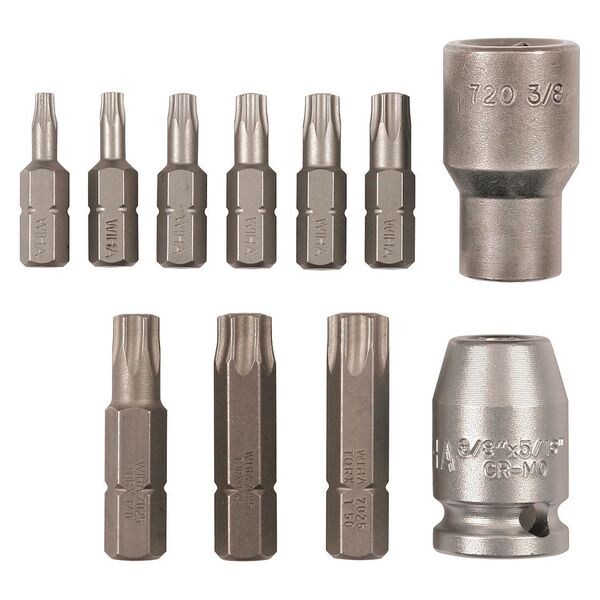 WIHA TOOLS 72590 Torx Bit Set, Steel, 11 pieces. is a professional-grade product. The set comes with a total of eleven pieces. It includes five socket bits and six drive bits. Each bit has its own part number stamped on it for easy identification. They are made from steel for durability and long life. WIHA TOOLS 72590 Torx Bit Set, Steel, 11 pieces. is an essential addition to your tool collection