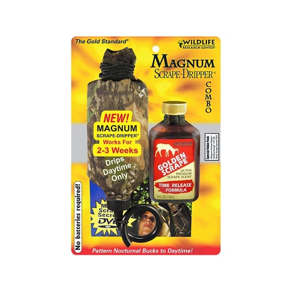 The Wildlife Research Center Magnum Dripper Deer Scent Combo allows a hunter to create an exceptional mock scrape or keep an existing scrape fresh. The Magnum Dripper is an amazing tool that drips the Golden Scrape buck lure during the day when the temperature rises but it stops dripping as soon as the temperature falls again. Golden Scrape is a combination of premium doe urine with estrus secretions and premium buck urine giving you the most natural smelling scrape scent on the market. This scent is also enhanced with subtle tones of fresh scraped earth and Territorial Musk making it the ideal choice for mock or natural scrapes. The special time-release formula will keep him coming back giving you the advantage. Combo includes the Magnum Dripper 4 ounce bottle of Golden Scrape and the Scrape Hunting book. Features -Temperature activated scrape dripper -Premium doe urine with estrus secretions combined with premium buck urine -Enhanced with subtle tones of fresh earth and Territorial Musk -Extremely effective at both mock and natural scrapes -Special time release formula -4 oz bottle