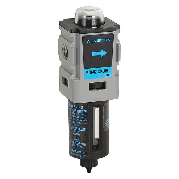 Compressed Air Filter, Filter Type Coalescing, Air Inlet Size 1/4 in, Air Inlet Type NPT, Maximum Flow Rate 12.7 cfm, Maximum Operating Pressure 150 psi, Maximum Operating Temperature 125 Degrees F, Overall Width 1 9/16 in, Overall Height 4 15/16 in, Drain Included Yes, Filter Bowl Material Polycarbonate, Drain Type Manual, Series M08, Air Outlet Size 1/4 in, Air Outlet Type NPT, Body Material Aluminum, Filter Bowl Capacity 0.4 oz, Filter Bowl Guard Included Yes