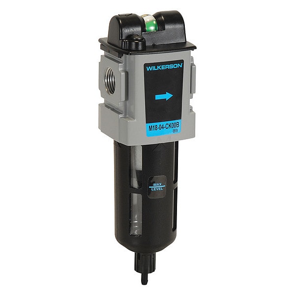 Compressed Air Filter, Filter Type Coalescing, Air Inlet Size 1/2 in, Air Inlet Type NPT, Maximum Flow Rate 85 cfm, Maximum Operating Pressure 150 psi, Maximum Operating Temperature 125 Degrees F, Overall Width 2 3/8 in, Overall Height 8 3/8 in, Drain Included Yes, Filter Bowl Material Plastic, Drain Type Manual, Series M18, Air Outlet Size 1/2 in, Air Outlet Type NPT, Body Material Aluminum, Filter Bowl Capacity 1.7 oz, Filter Bowl Guard Included Yes, Filter Element Material Borosilicate Cloth