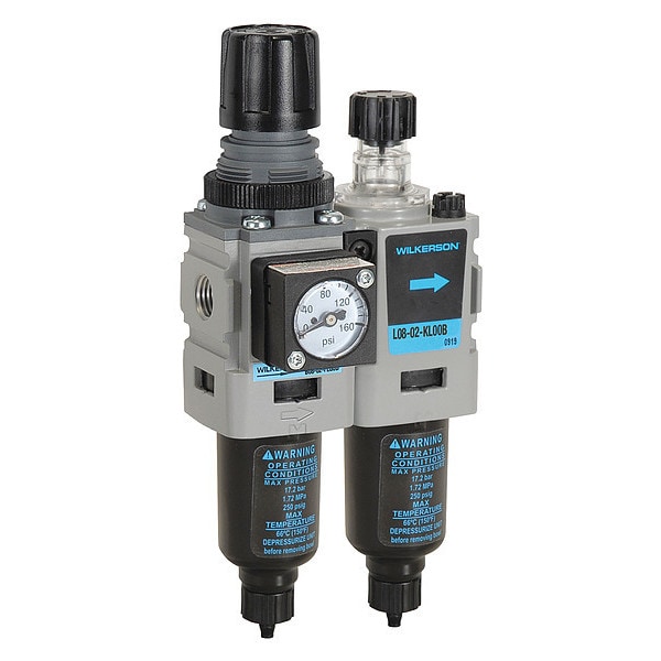Filter/Regulator/Lubricator, Air Inlet Size 1/4 in, Air Inlet Type NPT, Maximum Flow Rate 28 cfm, Maximum Operating Pressure 250 psi, Filter Rating 5 micron, Filter Bowl Material Aluminum, Filter Bowl Capacity 0.6 oz, Lubricator Bowl Capacity 0.6 oz, Drain Type Manual, Overall Width 3 1/8 in, Series D08, Adjustment Mechanism Knob, Adjustment Mechanism Material Acetal, Air Outlet Size 1/4 in, Air Outlet Type NPT, Body Material Aluminum, Drain Included Yes, Filter Bowl Guard Material Aluminum
