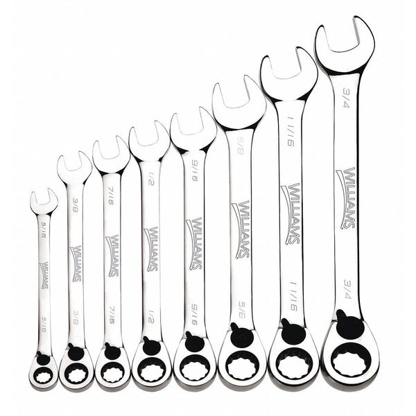 (8) Reversible Ratcheting Combination Wrenches: 5/16" x 5-1/4", 3/8" x 6-1/4", 7/16" x 6-5/8", 1/2" x 7", 9/16" x 7-3/8", 5/8" x 8-7/32", 11/16" x 9", 3/4" x 9-3/4", Plastic Tray
