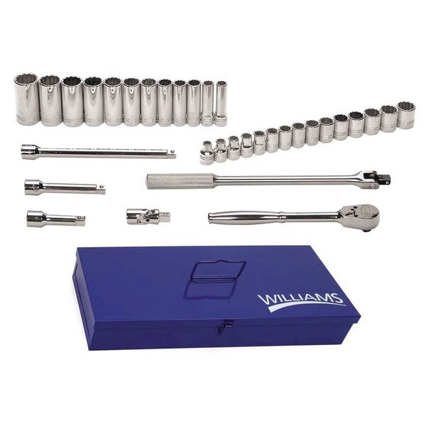 Williams Socket and Tool Set, 1/2" D, 12Pt, 33pcs., System of Measurement: Inch