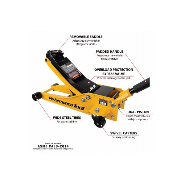 Dual piston 3-Ton Rapid Lift Jack raises most vehicles with just 3-1/2 pumps. Precision-welded steel construction with powder coat finish and rust-resistant hardware. Removable saddle adapts quickly to other lifting accessories. Modern design is ideal for the extra-low profile vehicles. Heavy duty ball bearing rear swivel casters for complete mobility. Lift capacity of up to 6000 lb. and a lift range of 3-1/4 in. to 20 in. 45-1/2 in. long handle with a foam sleeve to protect the vehicles side panel from scratches.