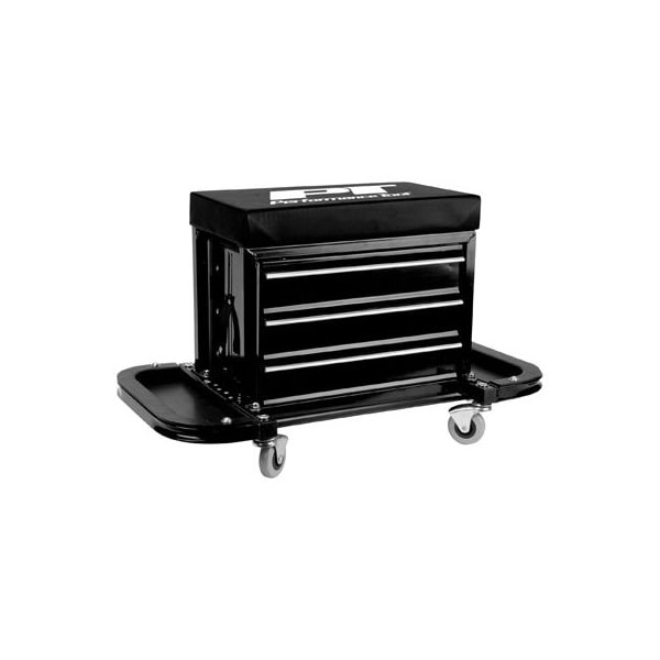 3 Drawer Rolling Mechanics Seat Reinforced Seat Supports Up To 350 LB 3 Drawer Tool Box With Roller Bearing Slides 2 Folding Tool Trays With Magnetic Pads Vinyl Padded Seat Cushion For Maximum Comfort & Support 2-1/2 Polyvinyl Chloride Full Bearing Casters For Smooth Movement Rear Tray Supports Screwdrivers & Pliers Seat Dimension: 16 x 9 Drawer Dimension: 13-1/2 x 7-3/4 x 2-1/4.