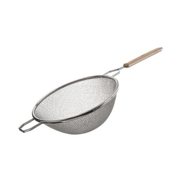 Double mesh strainer; 10 1/4 in (Diameter); 11 in handle length; 23 in overall length; Plated steel with wooden handle