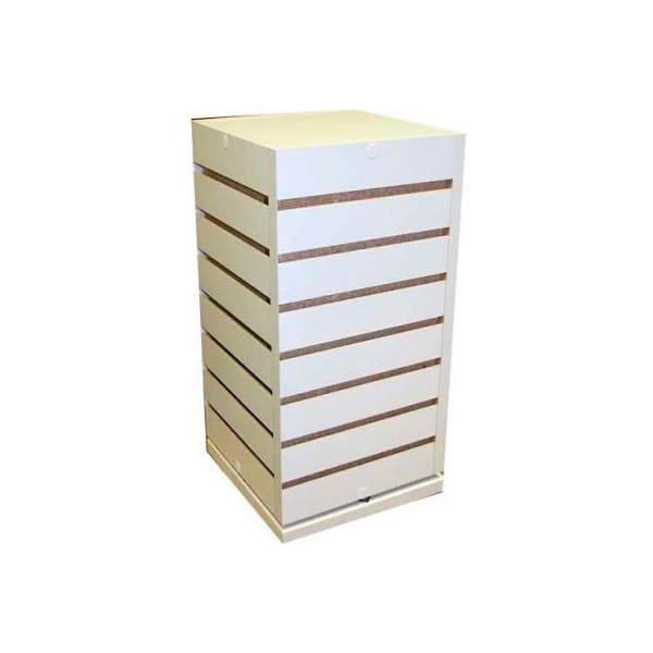 Slatwall counter cube display unit - white this 9"w x 9"d x 17"h slatwall countertop cube display unit is made of anchor core, making it 50% stronger than similar fixtures made with standard mdf (medium density fiberboard) and providing long lasting durability. 19 square feet display area. 2" on-center grooving and stands. This slatwall counter display unit ships fully assembled with spinner and ready for immediate use. Accepts all standard slatwall hardware and accessories.