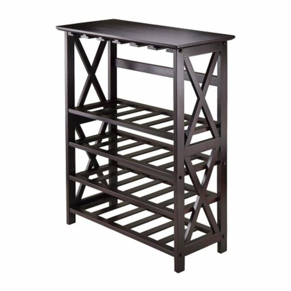 Rio wine Rack and Bar adds dining space and storage to your kitchen or dining room. This sturdy win rack able to accommodate up to 24 bottles and wine glasses. The simple style blends with X legs is great for kitchen or game room. Measures 13.39 D x 28.74 W x 35.67 H in. Espresso Finish. Made from combination of solid and composite wood. Assembly Required.