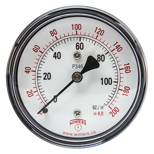 Low Pressure Gauge, Nominal Dial Size 2 1/2 in, Accuracy +/-3-2-3 Percent, Gauge Case Material Steel, Process Connection Type NPT, Process Connection Gender Male, Lens Material Polycarbonate, Process Connection Size 1/4 in, Field Fillable No, Process Connection Location Center Back, Case Color Black, IP/NEMA Rating IP52, Primary Pressure Range 0 to 200, Dry Dampening Feature None, Vibration Resistance None, Dial Color White, Pressure Gauge Type Low Pressure Gauge, Liquid-Filled Case No