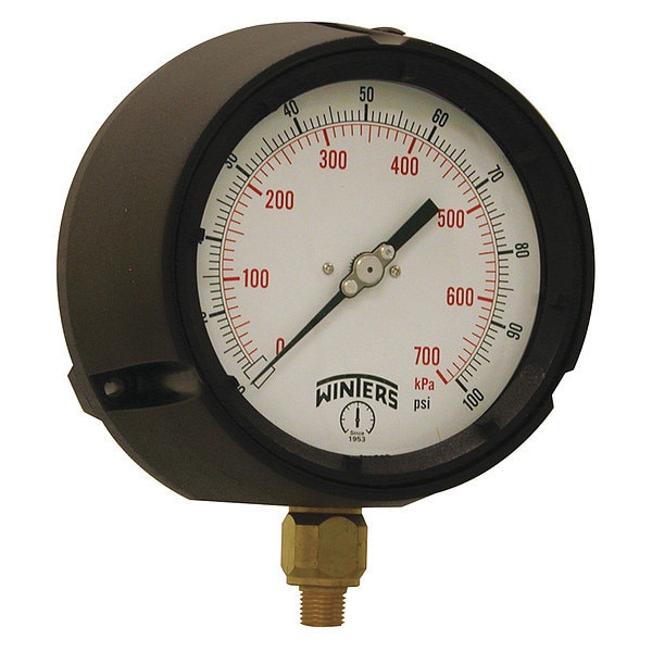Process Pressure Gauge, Nominal Dial Size 4 1/2 in, Accuracy +/-0.5 Percent, Gauge Case Material Phenolic, Process Connection Type NPT, Process Connection Gender Male, Lens Material Safety Glass, Process Connection Size 1/4 in, Field Fillable Yes, Process Connection Location Bottom, Case Color Black, IP/NEMA Rating IP65, Primary Pressure Range 0 to 100, Dry Dampening Feature None, Vibration Resistance Field-Fillable, Dial Color White, Pressure Gauge Type Process Pressure Gauge
