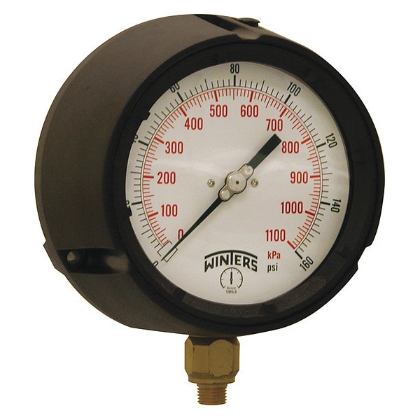Process Pressure Gauge, Nominal Dial Size 4 1/2 in, Accuracy +/-0.5 Percent, Gauge Case Material Phenolic, Process Connection Type NPT, Process Connection Gender Male, Lens Material Safety Glass, Process Connection Size 1/4 in, Field Fillable Yes, Process Connection Location Bottom, Case Color Black, IP/NEMA Rating IP65, Primary Pressure Range 0 to 160, Dry Dampening Feature None, Vibration Resistance Field-Fillable, Dial Color White, Pressure Gauge Type Process Pressure Gauge