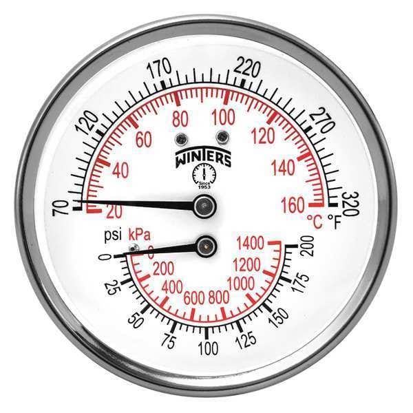 Tridicator 3 0/200 psi/Kpa 70/320 F/C, Cb, 3 in Dial, 1/2 in NPT Back Location, Steel Case Material